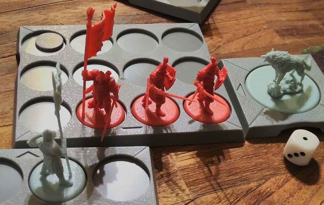 Ensuite, que serait un jeu basé sur Games of Thrones sans un peu d’intrigues politiques ? Ici, certains des personnages que vous recruterez n’ont rien à faire sur le champ de bataille, comme Cersei ou Sansa. Ces personnages non combattants, lorsqu’ils sont activés, sont placés sur un plateau avec 5 emplacements différents, chaque emplacement permettant une action différente : faire se battre une unité, en faire fuir une autre, en soigner une, etc. Le plateau est bien sûr vidé à chaque début de round. Là aussi on ajoute une petite dimension tactique bienvenue.