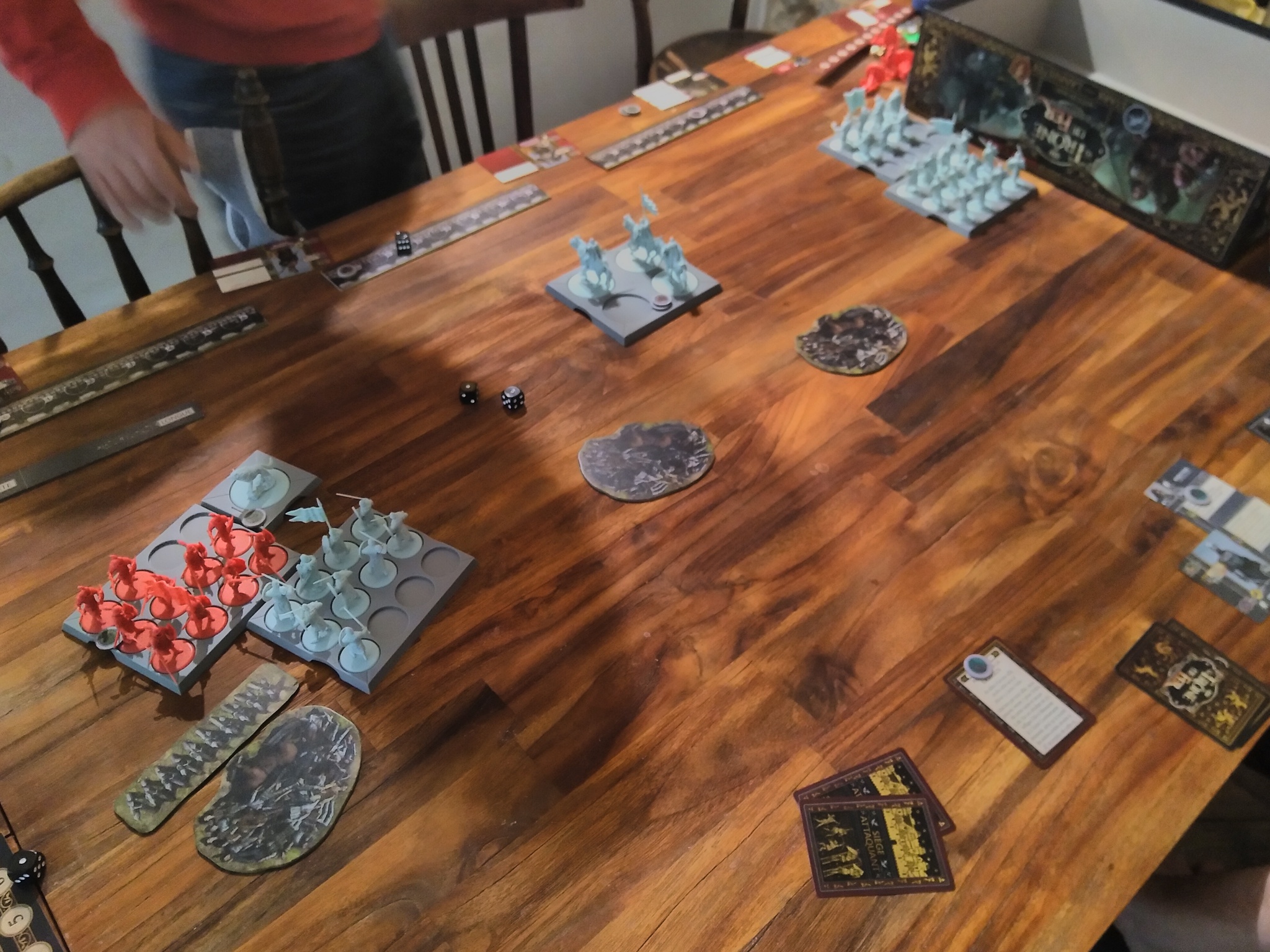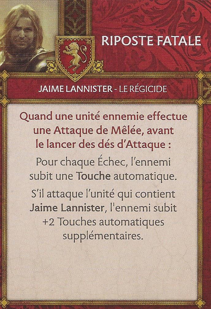 Mon autre soucis, c’est que si j’aime beaucoup A Game of Thrones, je trouve que la licence ne marche pas très bien sur ce genre de jeu. Certes, les batailles sont présentes dans l’histoire, mais elles ne sont pas du tout le cœur de l’histoire, qui se joue plutôt à la cour, dans les alcôves et via des conspirations. Quand on voit que le second personnage combattant des Starks est Lard John, c’est assez symptomatique : je parie que ceux qui n’ont pas lu les livres ne savent même pas qui c’est tellement il est secondaire dans l’histoire. Du coup, difficile pour moi de m’enthousiasmer pour un combat qui voit s’affronter des épéistes et des épéistes. Bref, il me manque l’univers de Warhammer, qui offre plus de possibilités pour ce genre de jeux selon moi. Bien sûr, ce retour n’est que partiel, car la richesse du jeu viendra aussi des autres unités et armées qu’il proposera, et cet avis mériterait d’être complété après des parties avec d’autres factions !