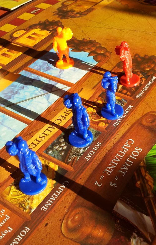 - des marchands qui permettent de compter double également pour les navires marchands, mais qui génèrent aussi 5$ immédiatement s’ils sont envoyés sur le nouveau monde,
