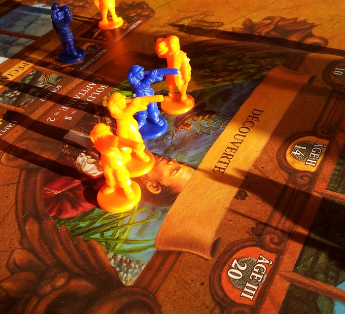 La partie débute calmement, chacun place ses forces. Dès le second tour, le Quai des colons affiche complet et les places y seront chères jusqu’à la fin du second âge ! Scoring oblige.