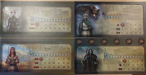 Darhen/Darh (car chaque héros a toujours son pendant héroïne) envoûte un puissant Golem dont il peut se servir en combat. Mais pour le faire apparaître, il faudra aller se battre d’abord ! Drukil/Drukia peut se changer en Ours. Si l’Ours a moins de 10 Points de Volonté, un autre Héros peut traverser la case où il se trouve sans perdre de points de Force. De même, les Paysans conduits par un Héros peuvent la traverser sans danger. Leander, le devin, peut regarder les cartes Evénement à l’avance. Avec Forn, quand une Créature doit gagner sa case, cette dernière est avancée d’une case supplémentaire dans la direction de la flèche (et oui quand on est Demi-Skral, on nous cherche moins les noises).