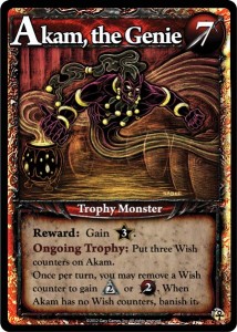 Quand on tue ce Génie, on gagne 3 points et on place 3 compteurs sur la carte. Ils représentent les 3 vœux que le génie peut exaucer et donc une fois par tour on peut enlever un compteur pour gagner 2 runes ou 2 combats. Une fois qu’il n’y a plus de compteurs sur la carte, le monstre est banni.