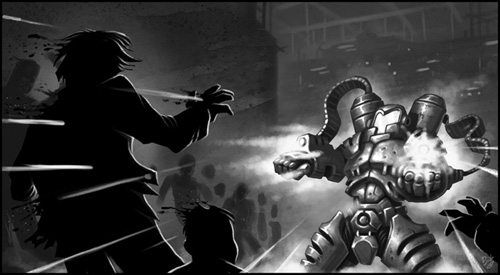 « Mes goûts de « consommateur » sont globalement les mêmes que mes envies de dessin : depuis Ultimate Warriorz, je travaille effectivement pas mal sur des univers tendance « med-fan sauce cartoon », mais j’aime pouvoir varier les plaisirs, bosser sur des créatures réalistes bien trash façon Chtulhu ou Polaris, des mechas à la « BattleChasers/Warmachines », des personnages post-apo’/Mad Maxiens, de la S-F « toon » à la Wildstar. »