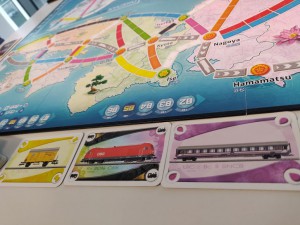 Ce plateau est donc bien réussi, toujours très lisible, digne des Aventuriers du rail, même si retrouver les villes japonaises n’est pas toujours chose aisée, n’étant pas habitué à la prononciation nippone. On y retrouve toutes les sensations du jeu de base, avec un niveau de pression supplémentaire sur la course à la construction des voies express.