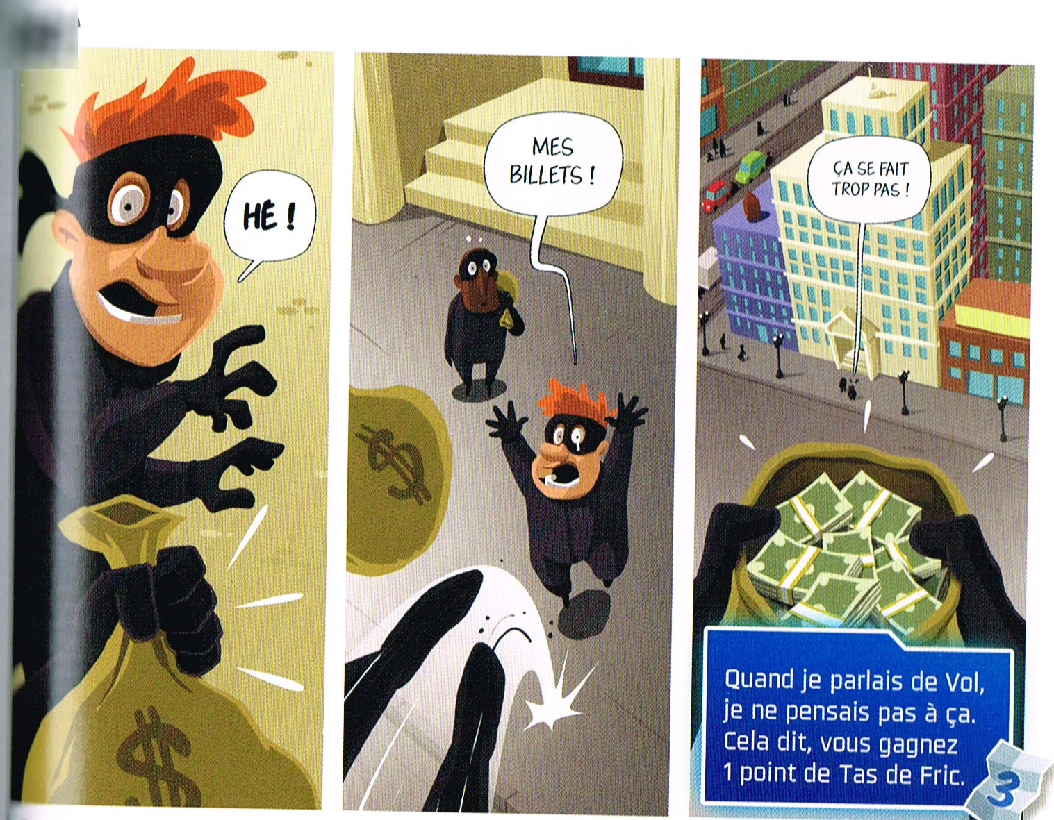 Pour cela, vous allez plonger dans un format de BD assez spécial puisque vous allez vite vous rendre compte que les cases de la BD ne se suivent pas. En effet, passé les 2 ou 3 premières pages où l’on vous présente l’histoire de manière tout à fait classique, le livre vous invitera à choisir, via des images ou via de la narration, comment continuer votre aventure. Le livre vous proposera par exemple, en tant que « héros décisionnaire », de prendre la grande avenue en vous rendant à la page 21, oubien d’entrer dans une ruelle sombre en allant à la page 121. Ainsi, vous choisirez vers quelle page aller, et cela sans retour en arriere possible, puisque la page vers laquelle vous etes envoyé à toutes les informations necessaires pour vous renvoyer vers une ou plusieures autres pages de la BD. Et ainsi, vous allez evoluer à travers les pages, feuilletant sans arrêt d’avant en arrière et inversement, en vivant l’aventure comme vous le souhaitez, et en prenant des choix vraiment impactants pour votre personnage.