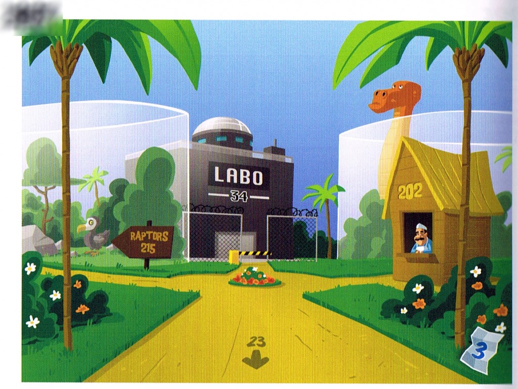 J’attaque mon exploration par le zoo. Le labo m’est pour le moment interdit (couleur noire). Par contre, plutôt que d’aller voir les raptors, j’irai bien prendre une glace, moi !