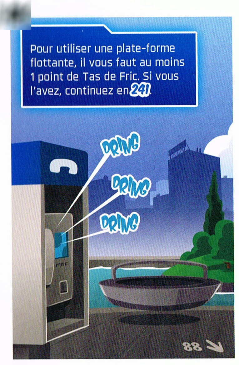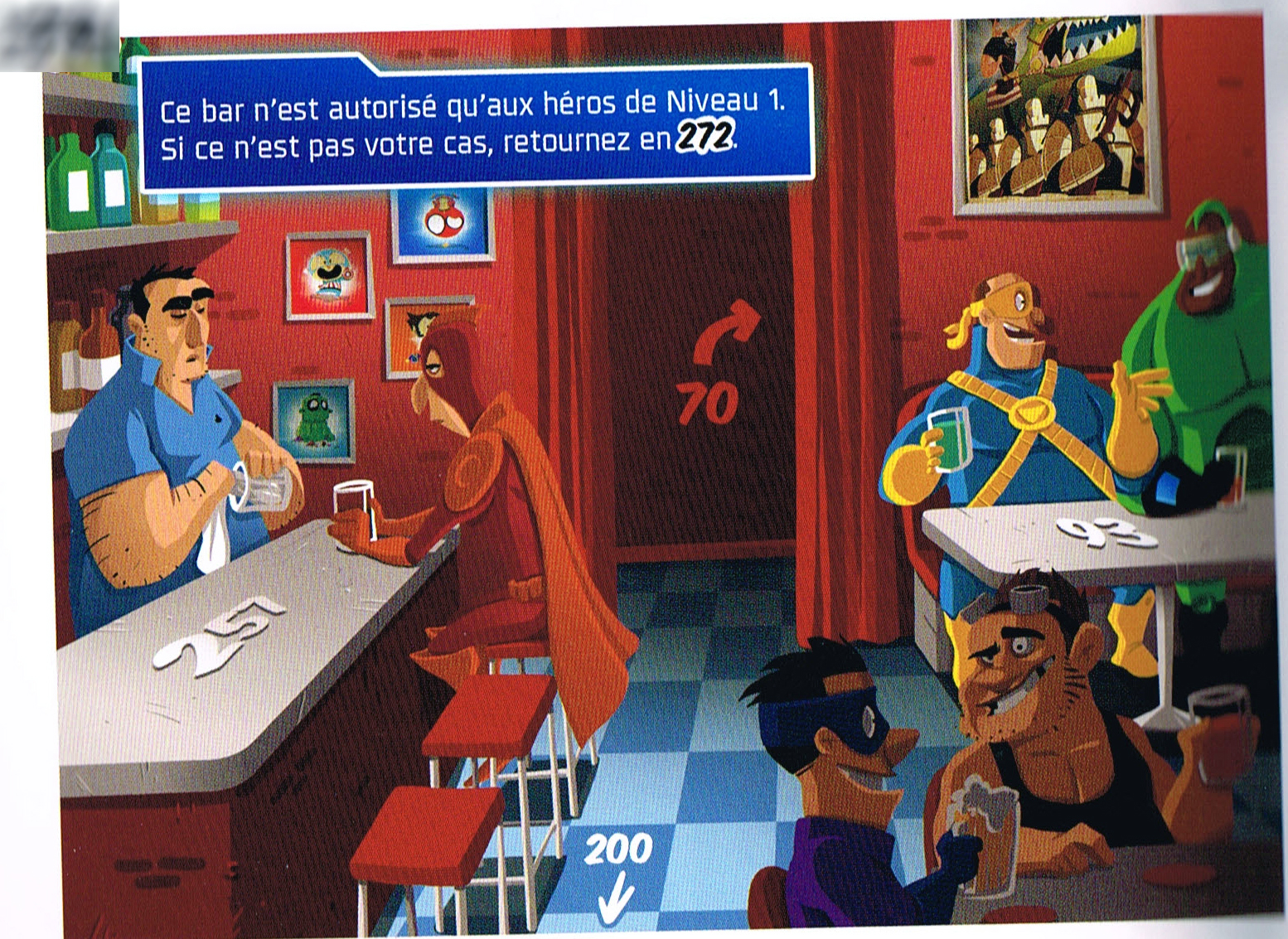 Le fait de réussir ou pas dans l’aventure va finalement dépendre de ces paliers de niveau à atteindre. Si vous vous débrouillez bien, vous allez cumuler assez de Grande Classe pour passer au niveau supérieur quand le moment sera venu. Par contre, et c’est très fourbe, si vous enchaînez plusieurs échecs, rien ne va vous stipuler que vous êtes en train de perdre. C’est seulement après plusieurs quêtes que vous allez finir par tourner en rond sans savoir quoi faire, car vous n’aurez pas l’expérience nécessaire pour accéder au niveau supérieur, et donc aux nouvelles quêtes. Vous errerez donc entre les différents lieux, à la recherche de quêtes que vous auriez raté, vous permettant de gagner les points nécessaires. Mais ce sentiment d’être perdu sans but est très frustrant, et c’est après avoir passé beaucoup de temps à tourner en rond que vous ne pourrez que vous résigner à abandonner la partie. Et c’est un pan de la BD qui m’a pas mal déçu. On à beau être dans une aventure facile, ou les choix sont censés être mineurs, le jeu nous met parfois en situation d’échec, en nous laissant aux fraises, sans nous aiguiller dans la bonne direction. C’est un point assez dérangeant car en opposition avec le fait que tout est fait pour laisser peu de libertés aux joueurs; car on se retrouve parfois vraiment dans des impasses, où l’on à envie d’arrêter le bouquin.