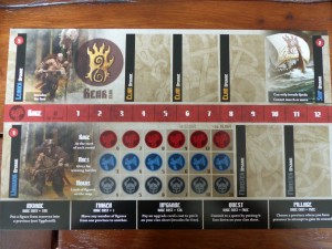 Chaque clan est donc muni de 8 guerriers, d’un leader, d’un bateau et d’une fiche de clan qui récapitule les différents pouvoirs, améliorations et les 3 caractéristiques du peuple : la rage, les haches et les cornes.