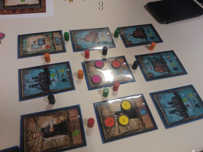 A chaque tour on place 9 cartes en carré (3×3) sur la table et les joueurs vont pouvoir placer leurs meeples entre les cartes dans le but de les acheter, d'activer des pouvoirs, ou de récolter de l'argent. Le prix est influencé par le nombre de meeples autour de la carte.