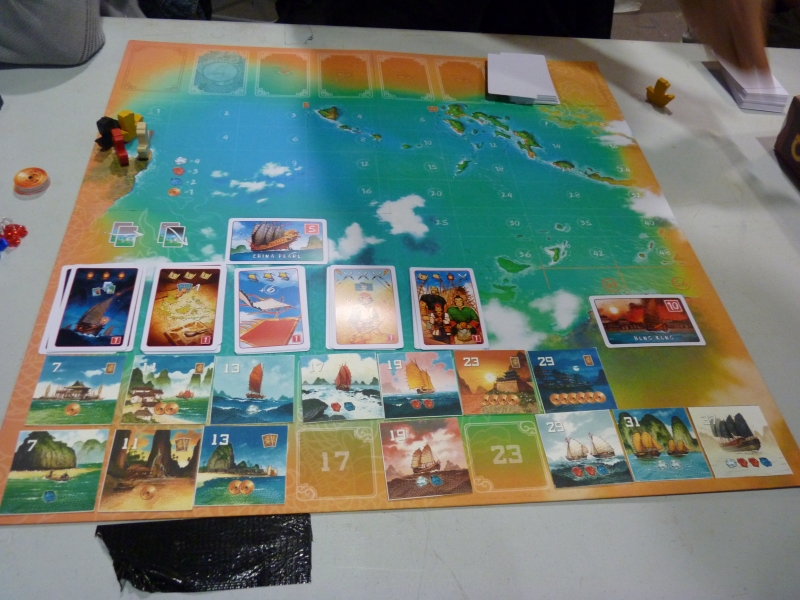 A votre tour, vous faites avancer votre bateau sur le plateau en posant une carte sachant que si vous gardez la même couleur d'un tour sur l'autre vous avancez tout droit, si vous changez de couleur, vous descendez (et plus vous descendez plus vous vous approchez du grand objectif qui rapporte bien, mais plus vous allez tout droit plus vous pouvez faire des rencontres…) attention, il faut toujours que les valeurs de vos cartes aillent croissant ! Et oui… sinon ça serait trop simple…