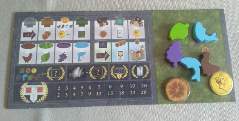 En terminant un paysage (lac, vigne, poulailler) vous récupérez immédiatement la ou les ressources correspondantes. Mais vous avez aussi des boulangeries pour avoir du pain ; des sénateurs pour avancer sur la piste banderole ; des marchands pour vendre ses ressources et gagner de l’or (ressource joker) ; des fontaines qui permettent de prendre des cartes fontaines ; ou encore les artisans qui vous offrent le droit de prendre une tuile sur la ligne du bas (parfois utile).