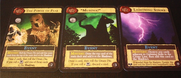 Les secrets font un super job : à plusieurs reprises dans la partie, vous pourrez intégrer un sombre secret à votre paquet. Ils vous punissent d’avoir fait quelque chose de répréhensible, comme fricoter avec les anciens du village (des personnes ultra-louches, autant vous le préciser) ou aller dans des lieux un peu interdits. Non contents de vous faire un malus de points de victoire, ils ne servent à rien, et si vous les avez en main en début de tour, vous pouvez les jouer pour piocher une Découverte Dérangeante (Shocking Discovery). Cette découverte, tirée d’un tas aléatoire, donnera des bonus au boss, rajoutera des cartes dans les ombres, rendra les cartes plus difficiles à acheter… Bref, vous foutra, vous et vos camarades-adversaires, dans une mouise encore plus profonde.