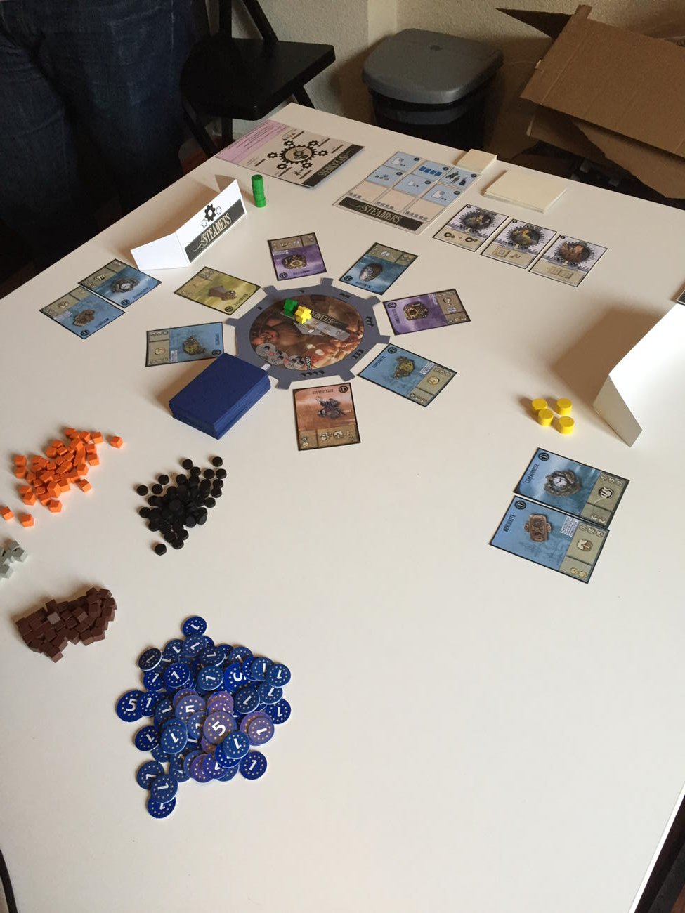 Le plus gros challenge sur le jeu (et jusqu’à la semaine dernière) a été la gestion du Bric-à-Brac. C’est l’aspect central du jeu, qui gère la réservation des inventions que les joueurs vont acquérir, mais aussi l’ordre du tour de jeu. Je pense qu’on est arrivé à quelque chose qui est tout à fait en accord avec la thématique, et très bien équilibré.