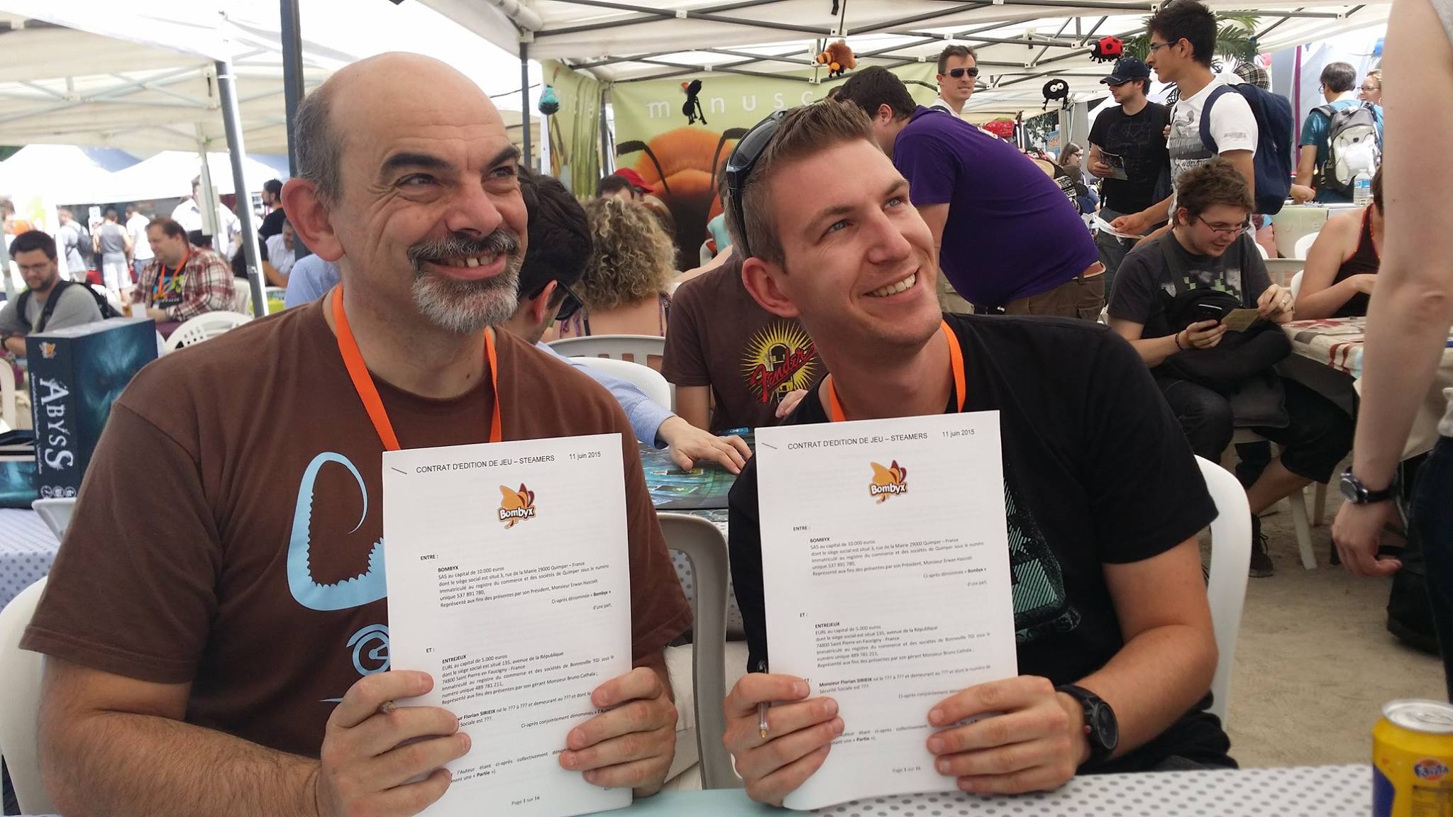 Et bien, deux mois après, c’est Cannes. Je parle à droite à gauche de mon idée, et je vois que j’ai un créneau. Ça intéresse des gens. Pendant le festival, je discute aussi avec Bruno Cathala, de tout et de rien, et de prototypes, mais pas de celui-là. D’autres, sur lesquels il me propose de jeter un oeil avisé. N’ayant pas de nouvelles, je le recontacte en septembre pour lui demander s’il a eu le temps de tester les protos, mais que sinon pas grave, je travaille sur un gros projet. Et là, on en parle, je lui envoie des règles, puis un proto. Il teste, et me rappelle le lendemain. On passe plus d’une heure au téléphone à discuter du jeu. Et c’est parti : « Euh, tu voudrais travailler dessus avec moi Bruno ? » On passe 3 mois à travailler, changer, débugguer, recommencer, pour arriver à une version qui tourne en décembre. Et la veille de Noël, j’ai un appel de Bruno, qui m’annonce que Bombyx va l’éditer.