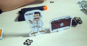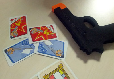 En compagnie de Ludovic Maublanc, nous avons également fait une partie de la seconde édition de Cash’n Guns. J’avais acheté la première édition et j’ai été très agréablement surpris par cette nouvelle version. Dans ce jeu, les joueurs incarnent une bande de bandits qui partagent un butin. Chacun est armé, et la tension est palpable. A chaque tour, chaque joueur pourra pointer son revolver en mousse chargé ou non vers un autre joueur.