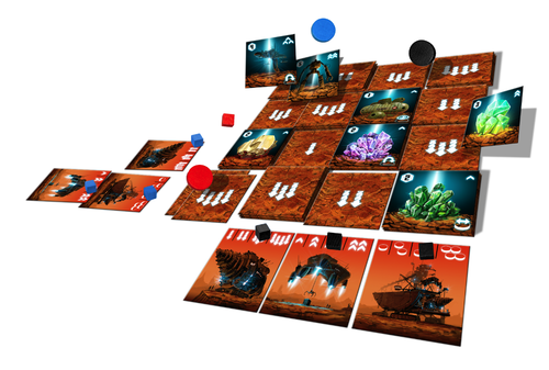 Qu'est-ce donc ? Total Recall ? Oui, bon, pas vraiment, c'est surtout un jeu de pions et de tuiles en fait. Vous allez devoir déplacer votre pion et le mettre au bon endroit au bon moment et révéler des tuiles Découverte. Ces tuiles valent des quantités de points de victoire variables, mais ces points peuvent également être utilisés pour augmenter le niveau d'équipement d'un joueur…