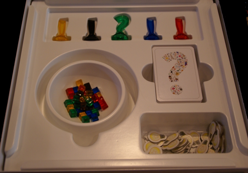 Le bol dans lequel sont rangés les petits cubes en plastique colorés est totalement amovible, vraie bonne idée pour le passer de main en main. Les petits jetons (ampoule simple ou ampoules doubles) représentent nos points de victoire (car vous pouvez compter les points si vous le voulez vraiment).