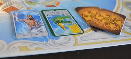 Sauf qu’en fin de manche, Zeus viendra punir les tricheurs ! À chaque fois que vous jouez une carte triche, vous la placez sur un paquet de cartes correspondantes. Il existe quatre cartes de protection divine (car Zeus regarde ailleurs) qu’on mélangera au paquet de cartes illégales, et on en tirera deux. Si un monstre apparaît, il est disqualifié…