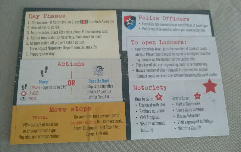 Au début d’un jour, chaque joueur commence à percevoir son revenu selon sa piste de revenu. On commence avec 9 000 $, bien utile pour engager des contacts ou des gangs pour détourner la police de notre chemin.