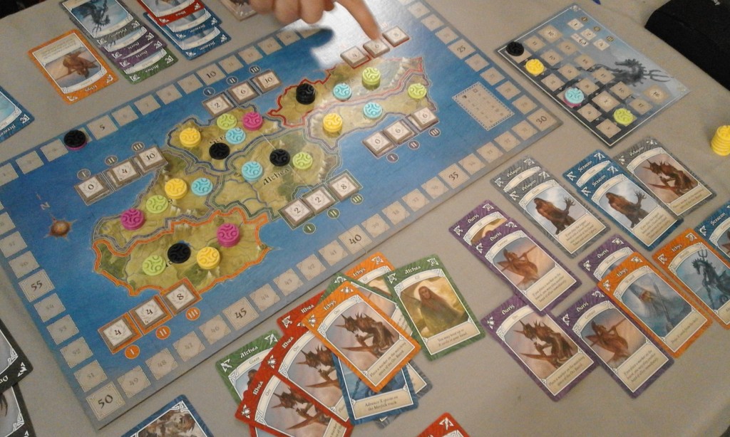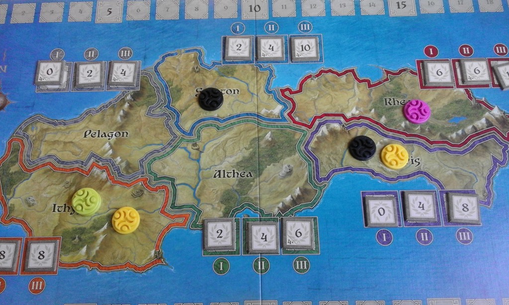 Ci-dessus, un joli coup : le joueur pose un centaure. Il place un MC sur Rhéa et peut donc rejouer (pouvoir du Centaure). Il rejoue un Centaure et place un MC sur Althéa et peut rejouer. Il choisit de renforcer son contrôle sur Rhéa en jouant les Elfes, qui permettent de garder en main 1 carte par Elfe posé. Le joueur n’alimentera pas le marché.