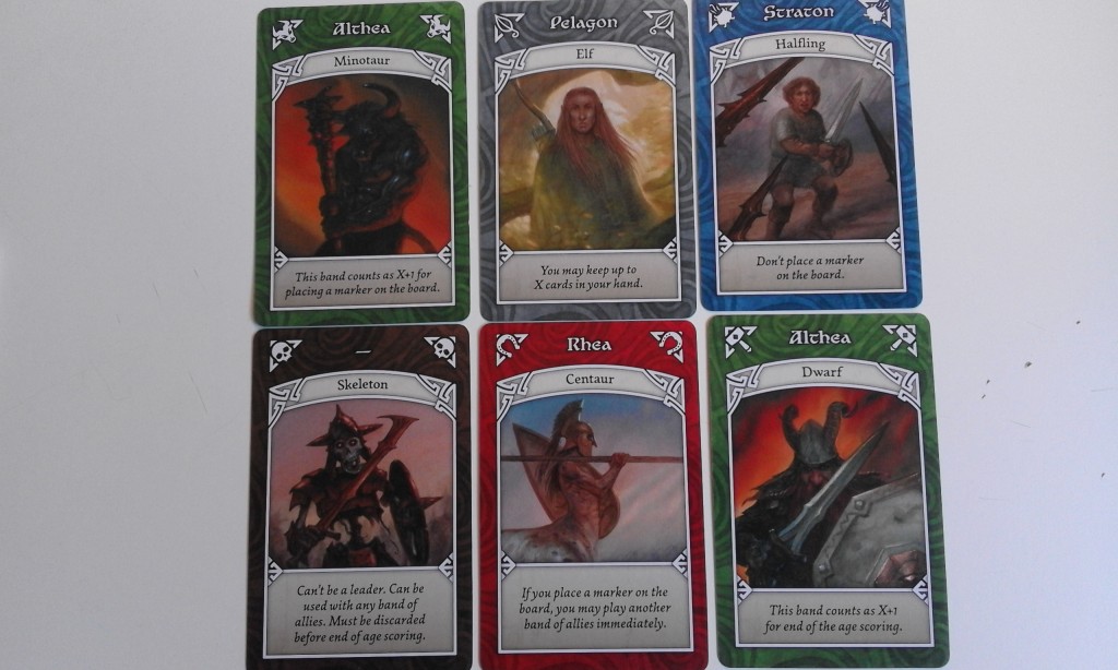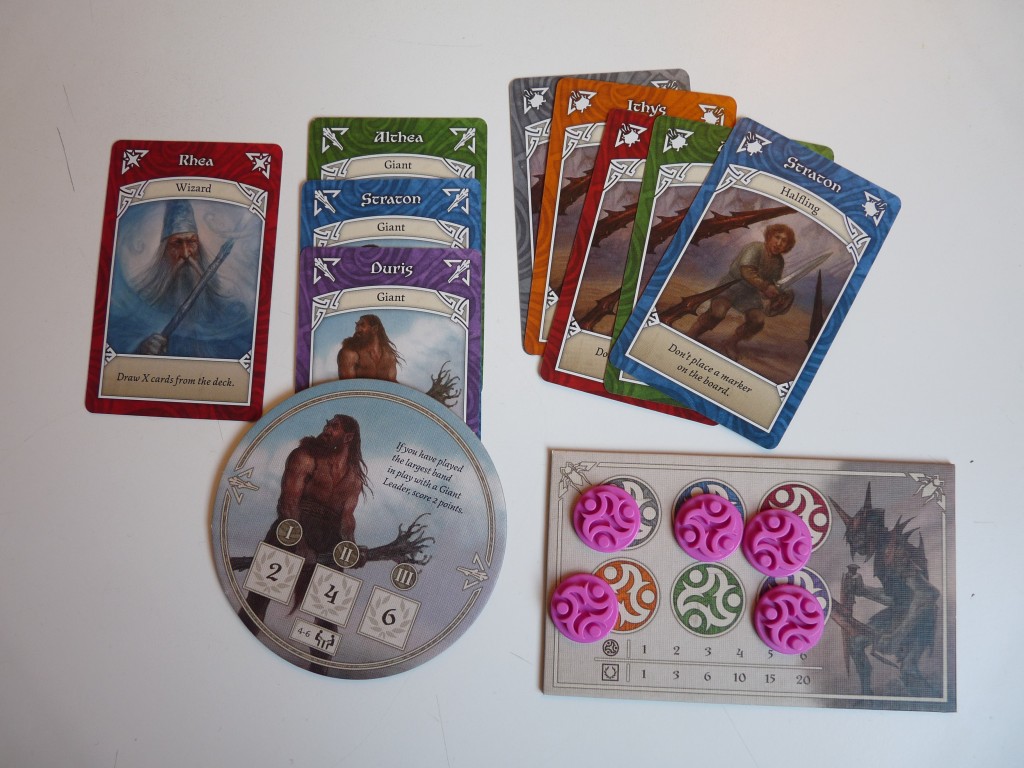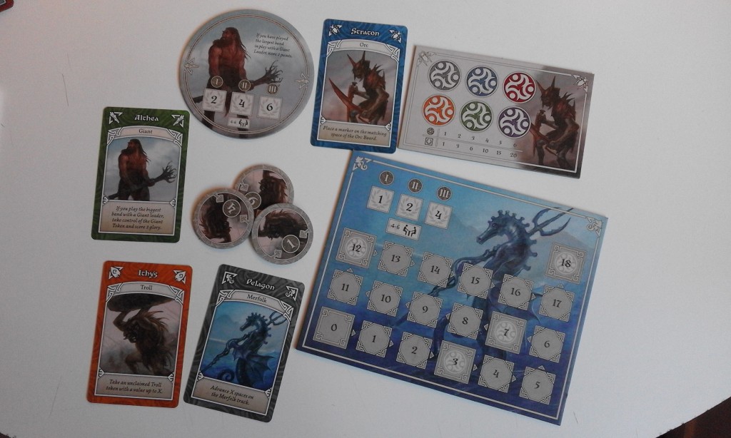 Les Géants (si votre série a un leader Géant, prenez le gros jeton Géant et gagnez deux points. Deux encore si vous le possédez à la fin de la manche. Vous pouvez vous le faire chiper si votre adversaire fait une meilleure série), les Merfolks (chaque série vous fait progresser sur la piste (plateau à part), vous gagnez X points si vous êtes en tête mais surtout, à certains points de passage, vous avez la possibilité de poser, en plus, un MC n’importe où sans suivre les règles de pose), les Orcs (vous placez, en plus de votre MC, un jeton sur la piste Orc, jusqu’à un total de 20 points) et les Trolls (qui gagnent les égalités).