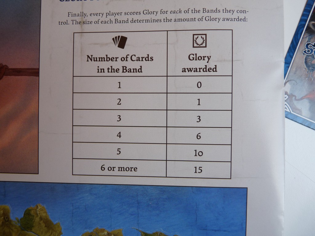 Lorsque le troisième dragon apparaît, la manche est finie. C’est le décompte : Les points de gloire par série. Et les majorités par territoire. S’il y a égalité, les joueurs additionnent les valeurs et divisent par le nombre de joueurs en concurrence. Sinon, le premier gagne le maximum de points, le second la valeur inférieure.