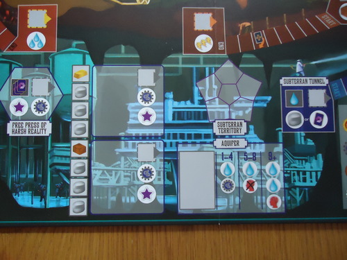 Vers la fin de partie, je rush la piste d’allégeance souterra parce que j’avais pris un deuxième spécialiste souterrain avec ma carte de choix éthique. Mais je suis en retard. Au commencement du jeu, il y avait 3 spécialistes souterrains sur 6 (Jérôme, Greg et moi) et je me suis dit que ça allait avancer rapidement mais mes compères en avaient décidé autrement… et je me retrouve un peu seul sur cette bataille !