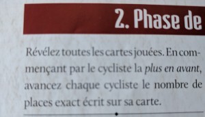 — Oui, son set de cartes, si tu préfères. Bref, il pioche des 4 cartes, en choisie une qu’il garde cachée, puis défausse les 3 autres. Son coéquipier fait de même. Et si il n’a plus de cartes, il mélange sa défausse et refait un tas. Le tout en pédalant.