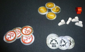 Les jetons ressource de départ et notre groupe de survivants tout fringant (pour l’instant).