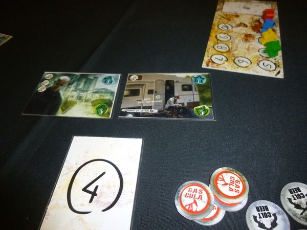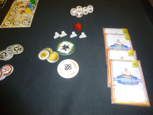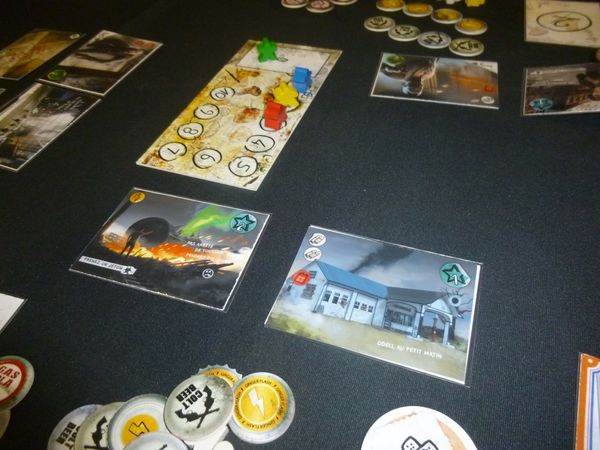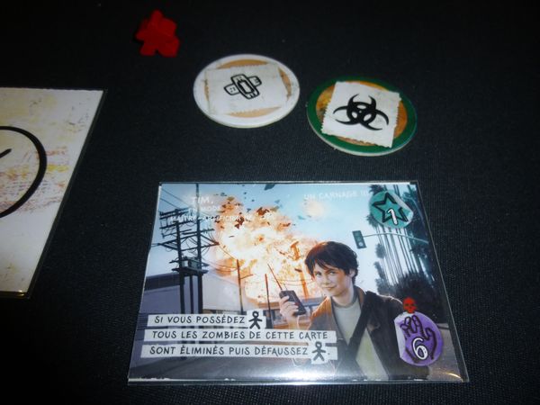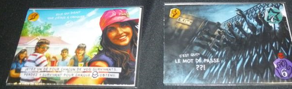 Certaines cartes aventure déclenchent également des évènements liés au type de lieu visité, à résoudre immédiatement ou lors du combat qui suit, aux effets divers et variés : perte d’une ressource, gain d’un jeton d’un certain type qui pourrait servir plus tard dans l’aventure, rajout de un zombie selon la face du dé obtenu en combat…