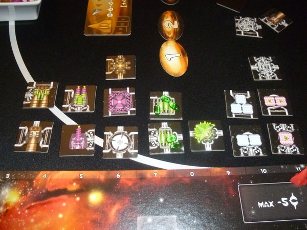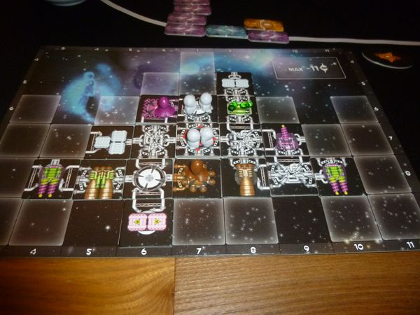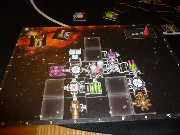 Lorsqu’on retourne une tuile, soit elle nous intéresse pas et on la dispose face visible dans le tas si bien que les adversaires pourront s’en saisir, soit on peut la mettre dans notre zone de stockage personnelle (deux max) pour temporiser, soit enfin on la dispose directement en la raccordant à un élément existant de notre station. Tout élément raccordé sur sa station l’est définitivement : il est interdit de redistribuer les éléments après coup !