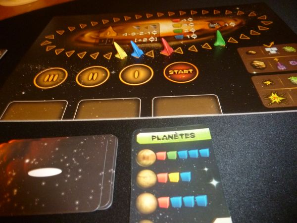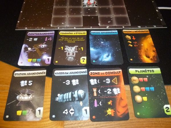 Nous voilà alors prêts à voyager et la deuxième phase débute par la révélation de cartes événements, une à une, en appliquant son effet à partir du joueur le plus avancé sur la piste d’exploration qui s’exprime en « jour de vol » : le voyage galactique entrepris n’est pas des plus calmes !