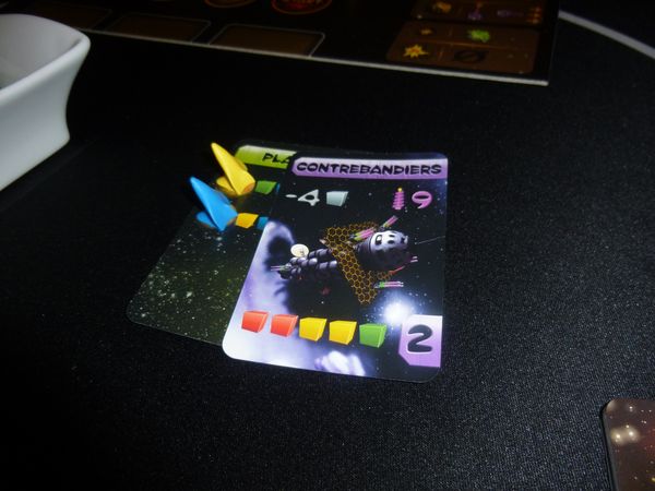 - On subit les contrebandiers si l’on possède moins de 4 forces d’attaque en cumulant boucliers et alien : ils nous dérobent deux ressources au choix du joueur (si notre vaisseau en stocke). Avec une force > 4, on peut attaquer les contrebandiers pour récupérer les marchandises listées sur la carte (en bas au centre) pour un temps, seulement si on peut les stocker dans les entrepôts dédiés dans notre vaisseau ;