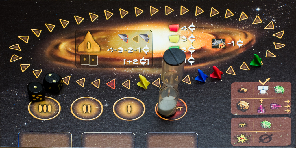 - Explorer les planètes permet de stocker les marchandises récoltés dans les caisses de notre transporteur, la résolution de la carte est réalisée dans l’ordre sur la piste de jour de vol si bien que le dernier ne peut rien prendre si les trois joueurs précédents ont déjà pillé les planètes disponibles !