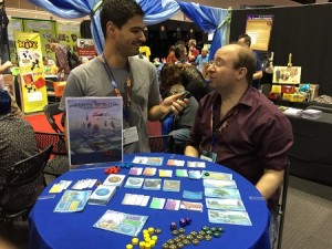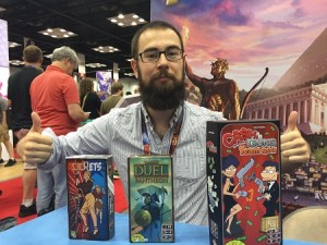 Le premier rendez-vous de la journée est dévolu à Justin Gary, l’auteur d’Ascension et éditeur chez Stoneblade Entertainment. Il nous présentera la dixième extension d’Ascension : War of Shadows. Celle-ci, selon les dires de Justin, est la plus abouties de toutes. Graphiquement, et même dans les mécanismes. On est enclins à le croire : l’état du plateau crée une dynamique jour/nuit qui influe les cartes jouées. Puis il nous a montré le deuxième jeu de sa petite gamme, You gotta be kitten me! Perudo avec des cartes et des chatons, voilà le menu.