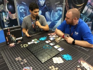 Nous tombons sur les canadiens de Vesuvius Media et un jeu de colonisation galactique au plateau modulaire et à scénarios variables. L’auteur, fan d’Innovation et jeune (22 ans) représentant de la nerdy attitude, nous présente donc son Cosmic Pionieers avec panache.