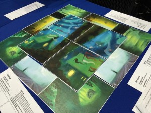 Après avoir croisé un gigantesque robot cosplay et une femme aux trois quarts nue mais toute body tatouée, nous arrivons sur le stand de Mike Selinker (de la vieille garde TSR et auteur du jeu de cartes Pathfinder) qui nous présente deux projets intéressants : Ninth World est un jeu de Skillbuilding, où son personnage s’adapte peu à peu, sans jamais dépasser une limite de pouvoir (donc pas de montée en pouvoir exponentielle), avec un scénario d’aller-retour sur une route.