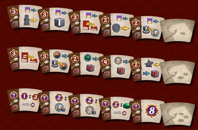 Une course a logiquement lieu sur ces marches dès le début de la partie car arriver le premier en haut permet d’empocher 7 PV (4 PV pour le 2ièmes, 3 PV pour le troisième) : je crains que cette nécessité rende les débuts de parties bien linéaires (un peu comme la piste de connaissance du jeu Orléans).