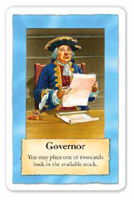 Heureusement, il existe une carte, le gouverneur, qui permet d’éliminer des cartes de sa main sans les remettre dans la défausse. Si, par exemple, une carte de lieu et une carte indien n’est plus utile, on peut les révoquer. Encore faut-il avoir simultanément en main la carte gouverneur et des cartes dont on veut se séparer.
