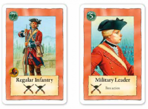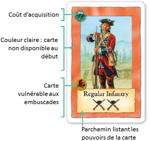 - Les cartes empire qui peuvent être soit des troupes diverses (armée régulière, milices, indiens, éclaireurs…), soit des cartes qui permettent de faire des actions nouvelles. Parmi celles-ci, certaines sont propres au joueur (bord de sa couleur) ou accessibles aux deux (bord vert)