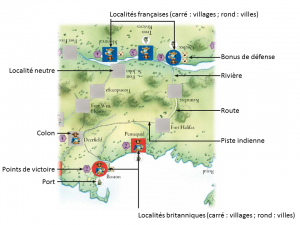 Pour acquérir les cartes de lieux, c’est plus compliqué : il faut jouer une carte de lieu qui permet de relier la nouvelle localité convoitée et y associer une autre carte comportant le symbole indiqué dans la carte d’origine et qui permet de joindre ce lieu : un bateau, un canoë, une charrette. Il faut parfois en outre commettre une carte qui présente le symbole colon, si le lieu est une ville à fonder. Par exemple, pour coloniser Trois Rivières à partir de Québec, il faut jouer les cartes Québec, une carte qui a un symbole canoé et une autre qui comporte un symbole colon.