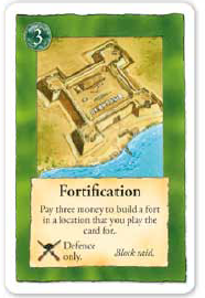 La carte de fortification permet, comme son nom l’indique, de fortifier des villes : elles seront mieux défendues en cas de siège et bloquent les raids des indiens comme nous venons de le voir. Mais ce n’est pas son seul avantage : elle permet, lorsqu’on l’a en main, de bloquer les raids ou d’être utilisée pour renforcer un siège, en défense.