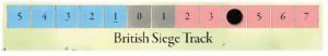 Les sièges sont un élément essentiel du jeu et peuvent durer longtemps (voire très longtemps) : pour attaquer une ville ou un village adverse, il faut dépenser le même genre de cartes que pour la coloniser plus une carte qui a un symbole militaire. A partir de là, on calcule les forces en présences et on le note à l’aide d’un marqueur sur une piste de siège.