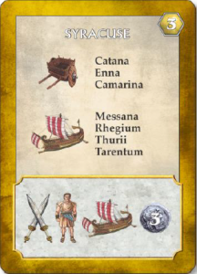 On peut d’ailleurs regretter que le concept n’ait pas été poussé au bout, en utilisant ce code couleur également pour les endroits que l’on peut rejoindre avec une carte donnée (par exemple, sur la carte ci-dessus, indiquer que Catana se trouve en Sicile, Tarentum en Italie). Ceci induit un changement beaucoup plus fondamental : alors que, dans A Few Acres of Snow, chaque joueur possède à sa disposition une carte de chaque lieu qu’il peut contrôler (la plupart des lieux sont donc en double), il n’en est pas de même ici.