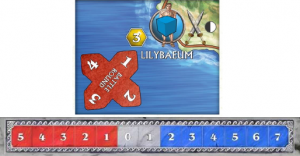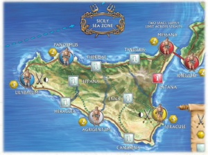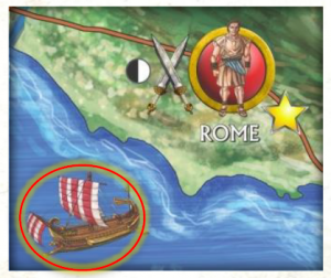 Deuxième rôle de la flotte, faire des blocus : en effet, une ville, pour rapporter des points lors des décomptes, ou pour que sa carte de lieu puisse être utilisée, doit être ravitaillée. Pour ce faire, elle doit être connectée, par terre ou par mer, à un symbole de ravitaillement. Pour la Sicile, l’Afrique et l’Italie, c’est assez simple, il y a des points de ravitaillement à Lilybaeum à l’ouest, à Syracuse à l’est, à Carthage et à Rome.