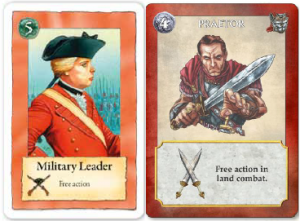 Les généraux peuvent être joués lors d’une bataille maritime et permettent de jeter un dé de plus. Celui qui fait le plus de dégâts est vainqueur, le vaincu doit évacuer les lieux. Les victoires maritimes comptent de plus sur la piste des victoires militaires qui est, on le rappelle, une condition de fin de partie et qui permet de marquer des points de victoire lors du décompte final.