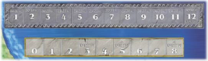 Quitte à rajouter des pistes, l’auteur n’a pas lésiné : il en a également rajouté une qui permet de suivre le nombre de victoires remportées par chaque camp. Ce nombre de victoires rajoutera autant de points à la fin de la partie (sauf en cas de mort subite, comme prise de la capitale adverse ou 25 points d’avance) mais est aussi une condition de fin de partie : arrivé à 8 victoires, un camp met fin à la partie. On risque donc de se retrouver dans des situations paradoxales ou un camp, en retard au score, n’a plus intérêt à attaquer de peur de remporter une huitième victoire et de mettre ainsi un terme au jeu. Cela ressemble, là aussi, à un mécanisme rajouté pour empêcher qu’une partie mal engagée ne s’éternise.
