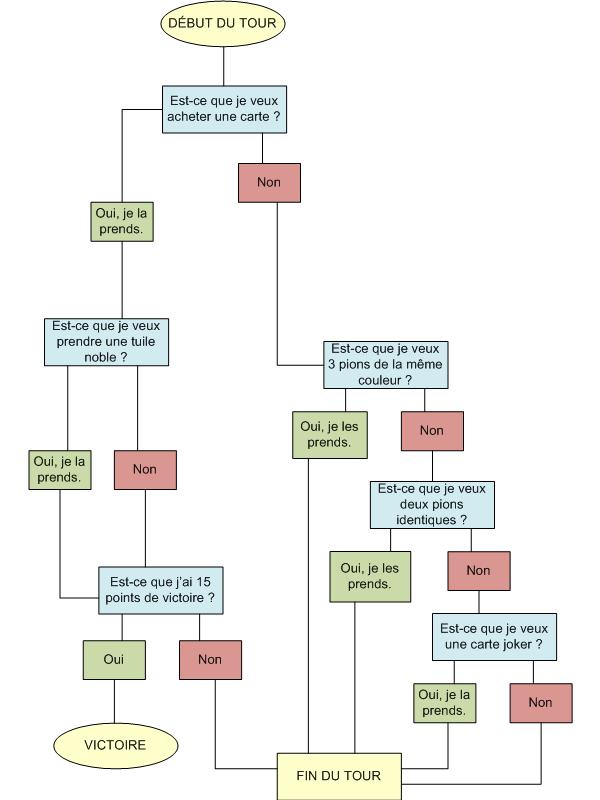 Dans le diagramme, tu sembles dire qu’on ne peut obtenir 15 points de victoire qu’après avoir obtenu un noble. En fait on peut aussi atteindre le score de la victoire juste en achetant une carte qui comporte les points de victoire qui nous manquent. Le « Non » de « Est-ce que je veux prendre une tuile noble ? » doit donc aussi conduire au « Est-ce que j’ai 15 points de victoire ? ». Et pour chipoter, c’est plus « Est-ce que je peux prendre une tuile noble », je ne pense pas qu’on puisse refuser 🙂
