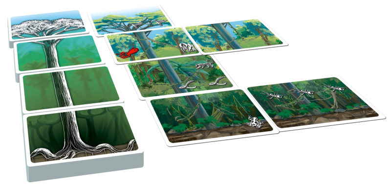 "Chaque joueur pose devant lui sa carte Début de forêt. Toutes les autres cartes sont mélangées ensemble et disposées faces cachées en 5 tas (on ne sait donc que l'étage auquel correspondra la carte).