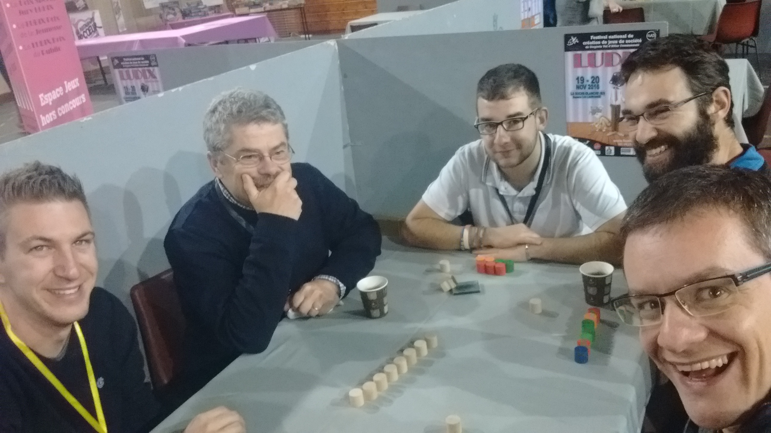 Etant dans le jury dit « adulte », et nous étions en charge de décerner uniquement les deux derniers. Mes collègues de jury parmi lesquels on pouvait retrouver des éditeurs (Matthieu BONIN-Iello / Mimo BAYEUX-BlueOrange / Cyril BLONDEL-FlipFlap Editions & auteur), des auteurs (ayant remporté un prix l’année précédente : Dorian BERTHELOT / Jim DRATWA / Christian MARTINEZ / Moi même), une ludothécaire (Marie-Hélène MORAN) ainsi que des joueurs un peu moins avertis, à savoir Mathieu MARQUEZ qui faisait déjà parti du jury jeunesse l’an dernier et une élue de la commune, Marianne BERTHOLOTTO, deux personnes qui permettent d’avoir un œil extérieur assez bienvenue.